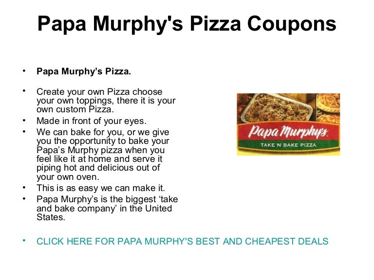 Papa Murphy Coupons, Promo Codes July 2022 - dzmind.com Save with 317 verified Papa Murphy promo codes and coupon codes July 2022. Most popular Papa Murphy coupon: $5 Off $20 Online Order. Dzmind Coupons & Promo Codes. Papa Murphy Coupons, Promo Codes ... Get a Large Cowboy Pizza on Fresh Pan Crust for $10. Valid in Participating United States Locations just. Limit 3. Expires on 05/18/2015. Get ...