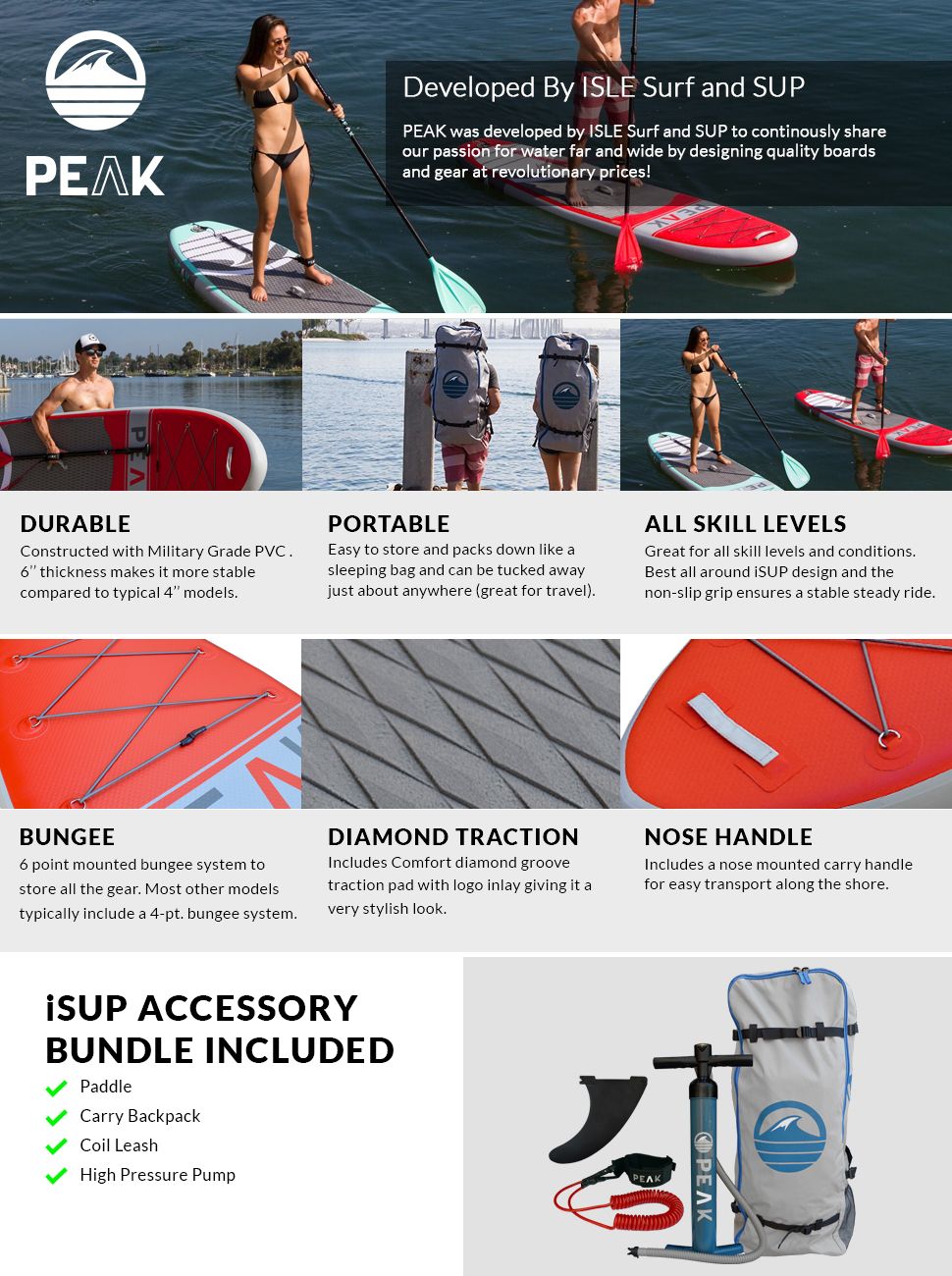 Amazon.com : Peak All Around Inflatable Stand Up Paddle Board Package ... 10'8"x31"x6" PEAK SUP by ISLE surf and SUP for $600 PEAK Inflatable Stand Up Paddle Board with Adjustable Paddle, Travel Backpack and Coil Leash, 128 x 31 x 6-Inches, White 10'0"x31"x6" Vilano Navigator by Cycling for Less for $380 Vilano Navigator 10' (6" Thick) Inflatable SUP Stand Up Paddle Board Package