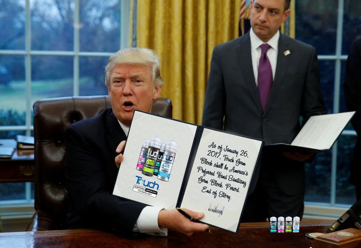 Touch Germ Block Spray Moisturizing Hand Sanitizer Travel Size 4-Pack ... Touch Germ Block Spray Moisturizing Hand Sanitizer Travel Size 4-Pack, 1 Ounce Each (Ocean Mist) $32.99 ($8.25/Ounce) Product Description Touch evenly sprays on like sunscreen and stays on like sunscreen to create a persistence barrier of germ protection for up to 6 hours.